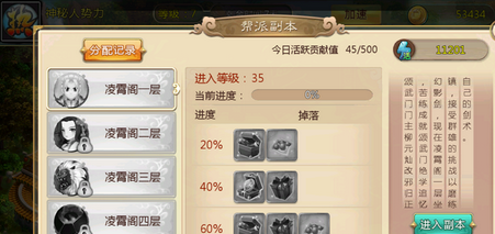 在帮派【凌霄阁】中,帮派管理人员可以选择开放各类帮派普通副本。玩家根据自己的等级可以选择参加合适的副本以获取道具奖励。